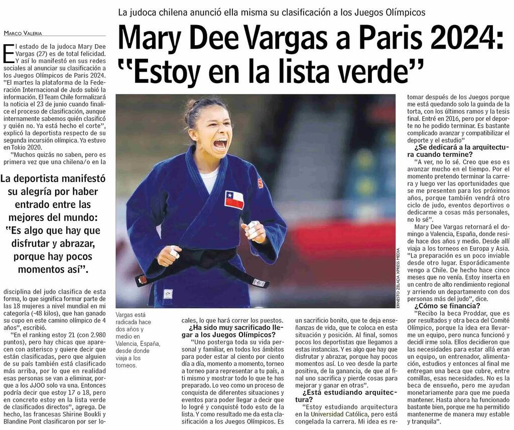 Las Últimas Noticias entrevista a la judoca Mary Dee Vargas, estudiante de Arquitectura UC, sobre su clasificación a los Juegos Olímpicos de Paris 2024.