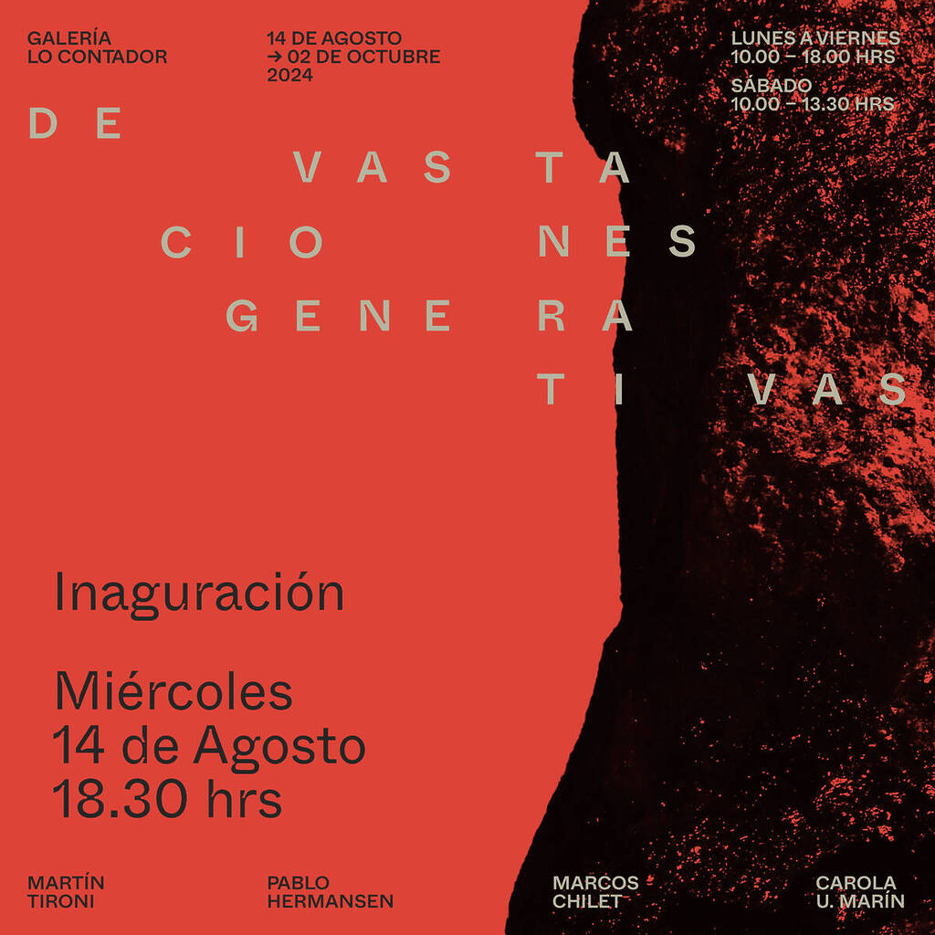 La inauguración de esta nueva muestra se realizará el miércoles 14 de agosto a las 18:30 horas en dependencias de la Galería Lo Contador, ubicada en El Comendador 1916, Providencia (sector Pedro de Valdivia Norte), y permanecerá abierta a todo público -de manera gratuita- hasta el 2 de octubre del presente año.