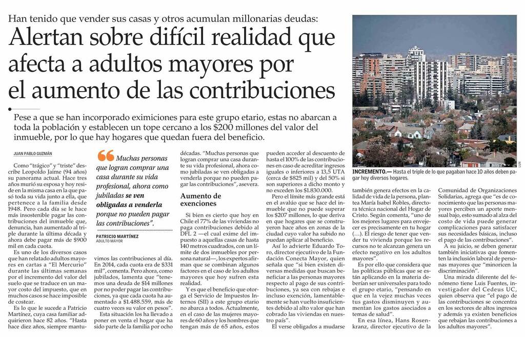 El Mercurio destaca que alertan sobre difícil realidad que afecta a adultos mayores por el aumento de las contribuciones. Pese a que se han incorporado eximiciones para este grupo etario, estas no abarcan a toda la población y establecen un tope cercano a los $200 millones del valor del inmueble. Habla el investigador Luis Fuentes.