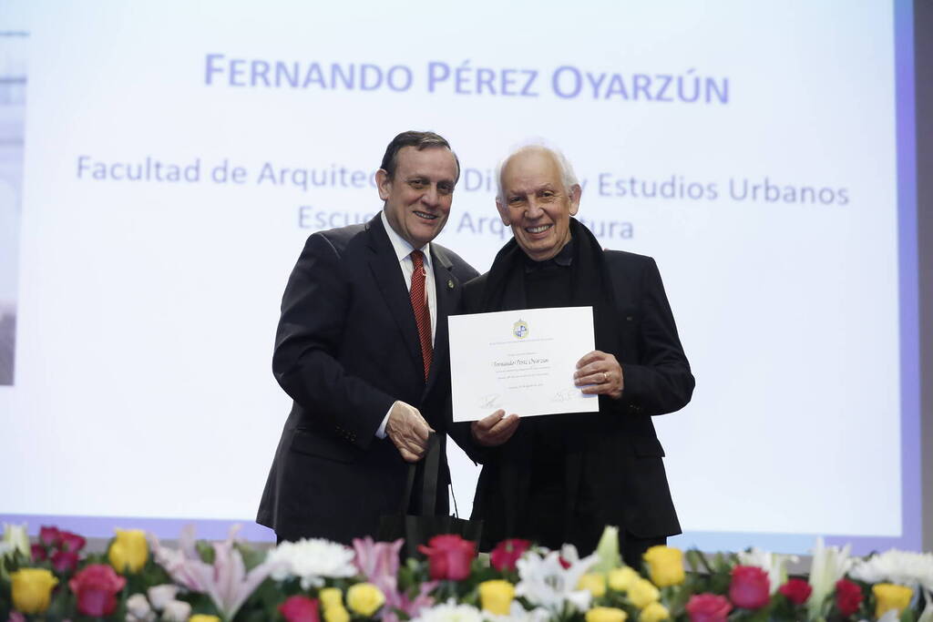 La ceremonia fue presidida por el Rector de la UC, Ignacio Sánchez, junto al Vice Gran Canciller, padre Osvaldo Fernández de Castro, miembros de la Dirección Superior e integrantes del Honorable Consejo Superior, entre los cuales se encontraba el decano de la Facultad de Arquitectura, Diseño y Estudios Urbanos (FADEU), Mario Ubilla.