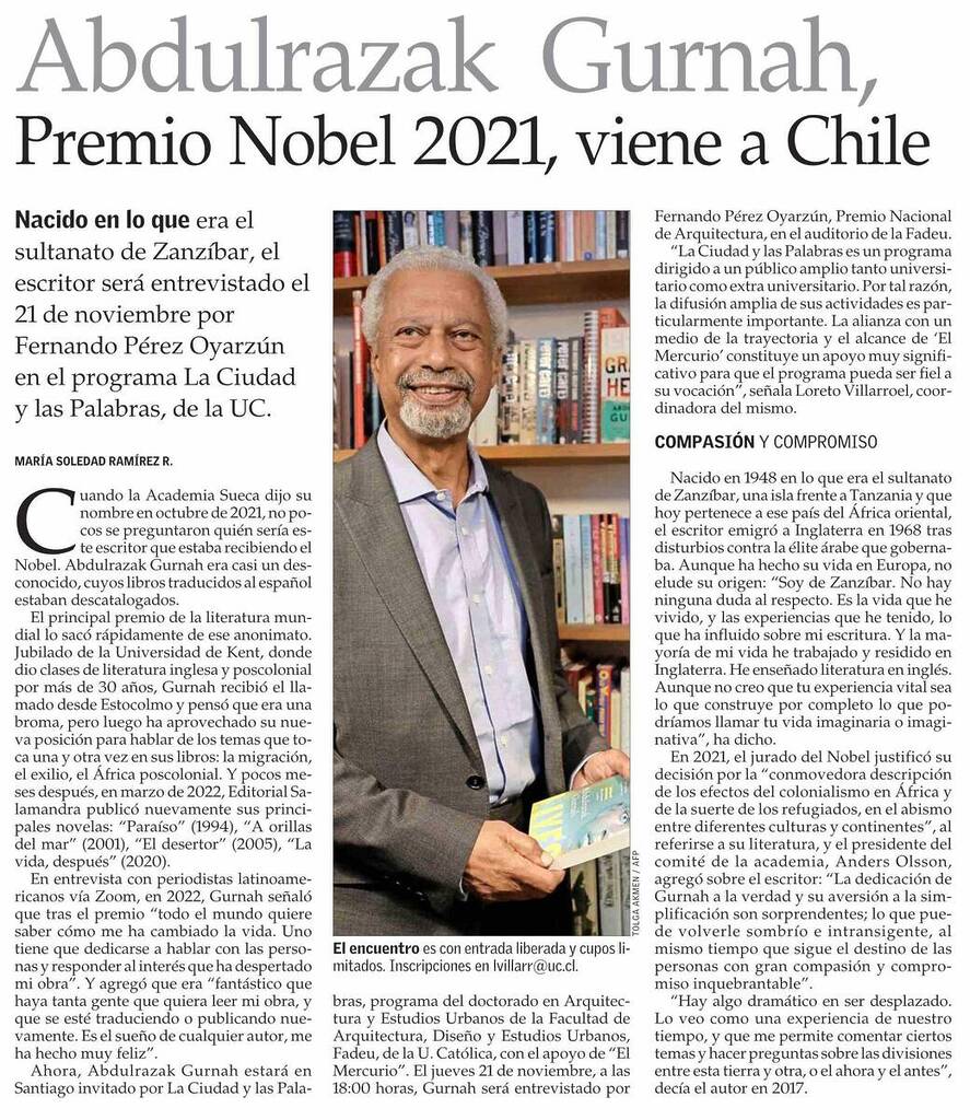 El Mercurio publica que Abdulrazak Gurnah, Premio Nobel 2021, viene a Chile el 21 de noviembre invitado por el programa La Ciudad y las Palabras UC. Habla Loreto Villarroel, coordinadora del proyecto.