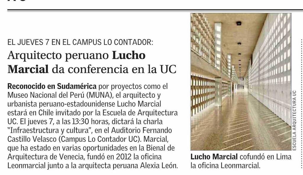 El Mercurio destaca que el arquitecto peruano Lucho Marcial da conferencia en la UC invitado por la escuela.