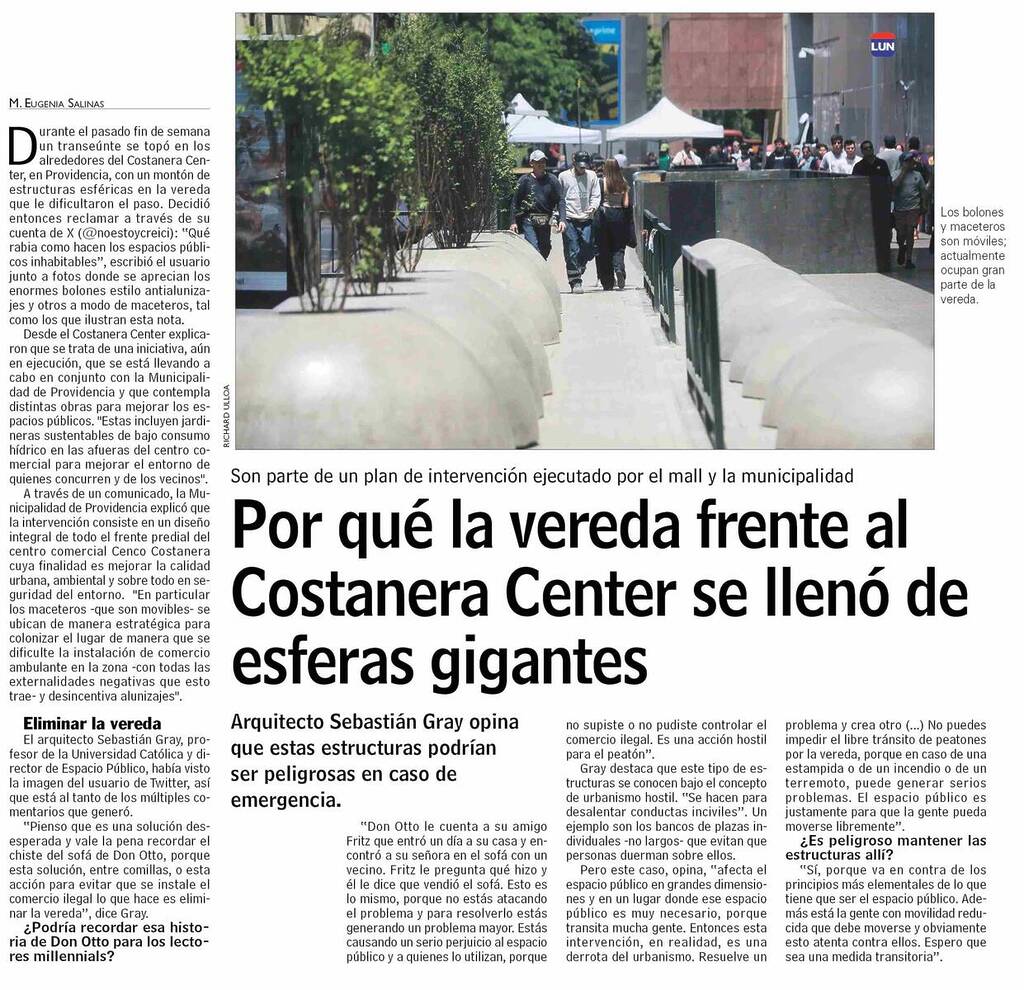 Las Últimas Noticias destaca que la vereda frente al Costanera Center se llenó de esferas gigantes como parte de un plan de intervención, ejecutado por el mall y la Municipalidad de Providencia, que busca mejorar la calidad urbana, ambiental y la seguridad del entorno. Habla el profesor de la escuela de Arquitectura Sebastián Gray. Otros medios citan la publicación.