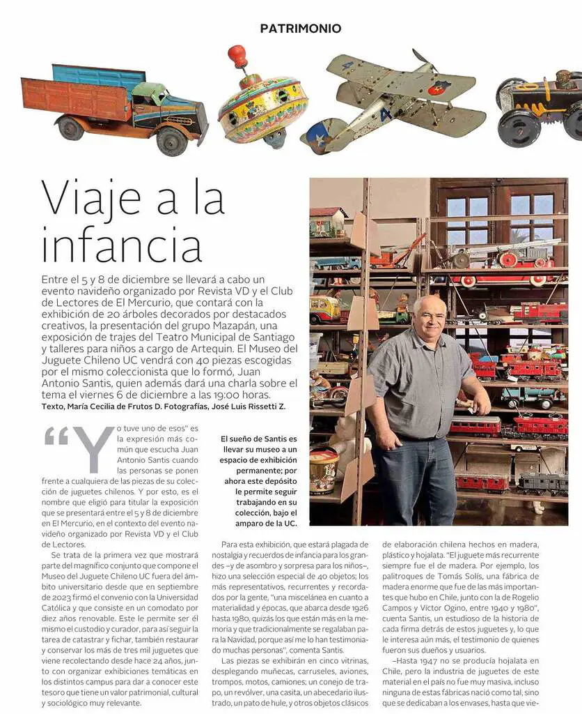 VD de El Mercurio destaca que una selección de 40 piezas del Museo del Juguete Chileno UC se presentará entre el 5 y 8 de diciembre en El Mercurio. Habla el responsable de la colección y académico de la Escuela de Diseño, Juan Antonio Santi