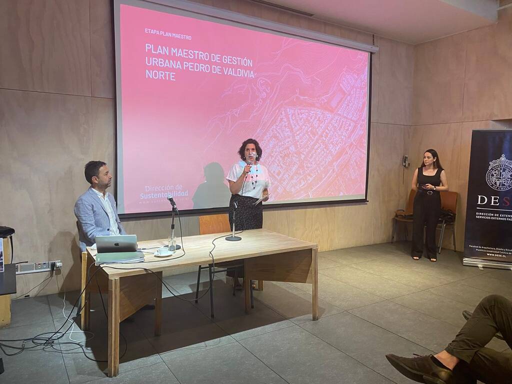 El subdirector de la Dirección de Extensión y Servicios (DESE) de la Facultad de Arquitectura, Diseño y Estudios Urbanos (FADEU), Nicolás Yopo, presentó el Plan Maestro de Gestión Urbana del Barrio Pedro de Valdivia Norte en un encuentro con vecinos, representantes del comité de urbanismo y la directora de Sustentabilidad UC, Maryon Urbina, en el auditorio Fernando Castillo Velasco.