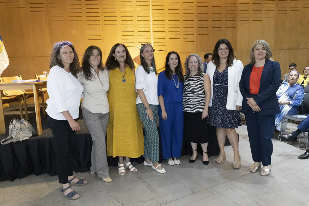 Durante la ceremonia, el Decano saliente, Mario Ubilla, entregó un reconocimiento a los directivos salientes del Decanato FADEU, profesores Felipe Encinas, Macarena Cortés, Pilar García, Paula Martínez y a la propia profesora Magdalena Vicuña, quien hasta antes de asumir como Decana se desempeñaba como directora de Investigación y Postgrado.