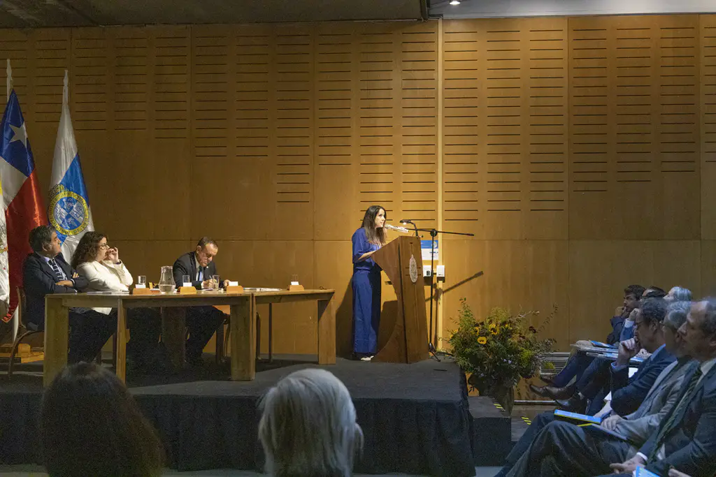 Durante su discurso, la Decana Magdalena Vicuña presentó a quienes asumirán como nuevos directivos en el Decanato FADEU.