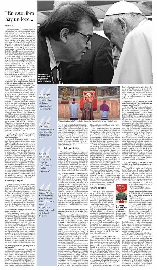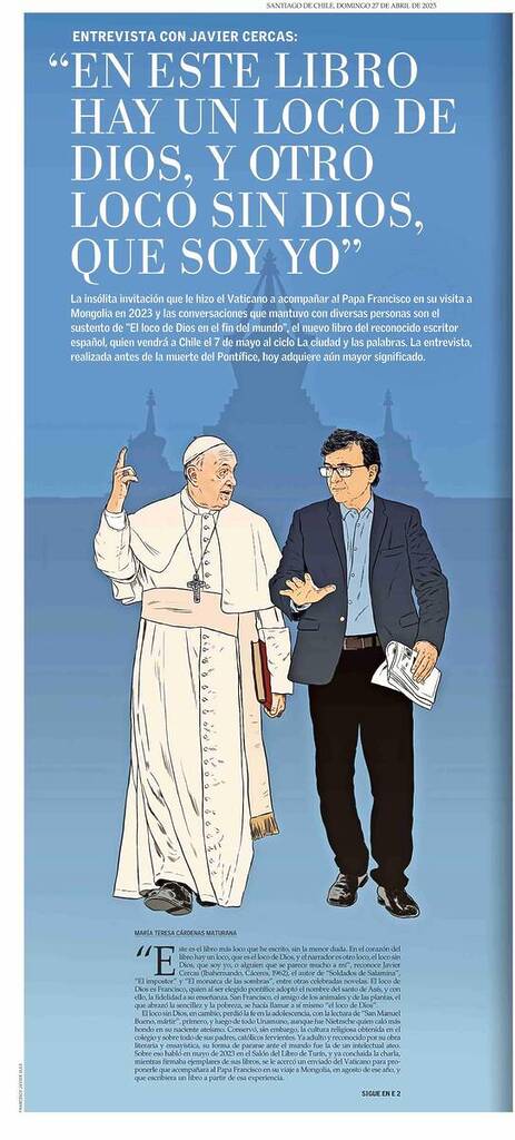 Artes y Letras de El Mercurio entrevista al escritor español Javier Cercas sobre la novela El loco de Dios en el fin del mundo, que recoge su experiencia acompañando al Papa Francisco en su visita a Mongolia en 2023 y las conversaciones que mantuvo con diversas personas. El escritor participará el 7 de mayo en el ciclo La ciudad y las palabras UC, que organiza el Doctorado de Arquitectura, Diseño y Estudios Urbanos, con apoyo de “El Mercurio”.