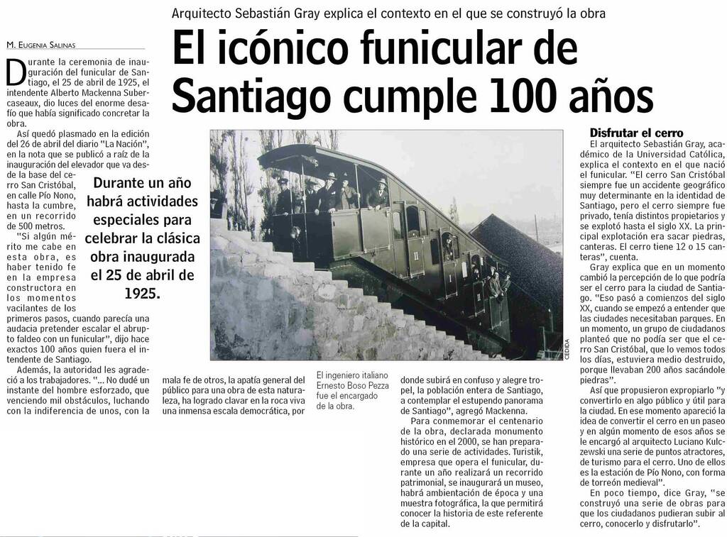 Diario Las Últimas Noticias publica artículo que conmemora los 100 años del Funicular de Santiago, en el que comenta el profesor de la escuela de Arquitectura, Sebastián Gray.