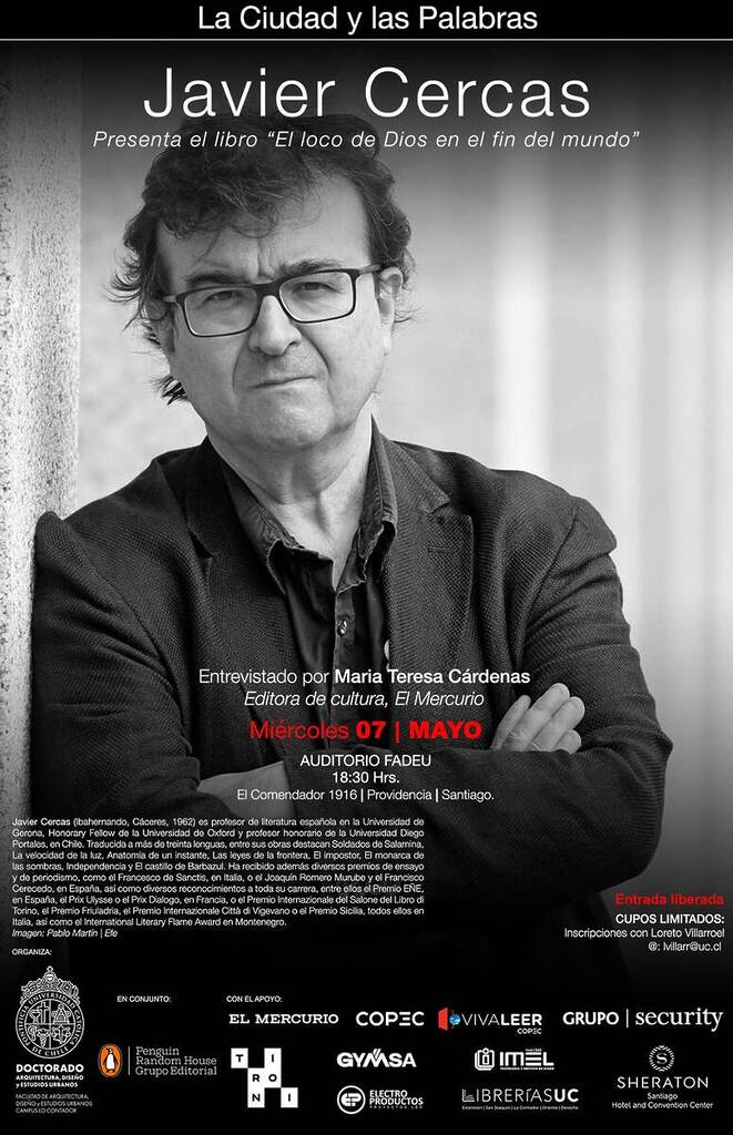 Se trata de la conferencia que dictará el 6 de mayo Edmundo Paz Soldán, titulada “Cómo construir una ciudad en el Amazonas”, y la presentación del libro “El loco de Dios en el fin del mundo”, de Javier Cercas, a realizarse el 7 del mismo mes en el campus Lo Contador.