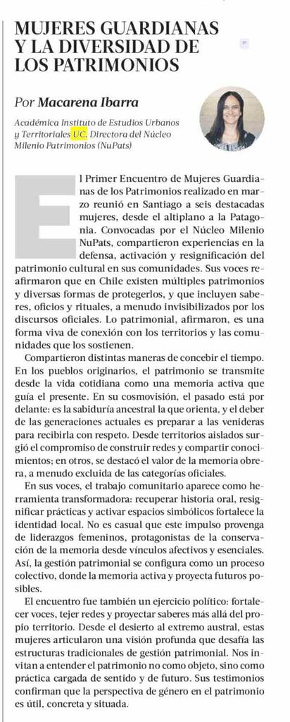 “Mujeres guardianas y la diversidad de los patrimonios”, es el título de la columna de opinión de la profesora del Instituto de Estudios Urbanos y Territoriales, Macarena Ibarra, que publico el diario La Tercera.