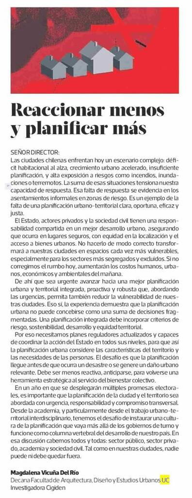 Diario La Tercera publica Carta al Director de la Decana de la Facultad de Arquitectura, Diseño y Estudios Urbanos, Magdalena Vicuña, sobre la importancia de la planificación urbana y territorial.
